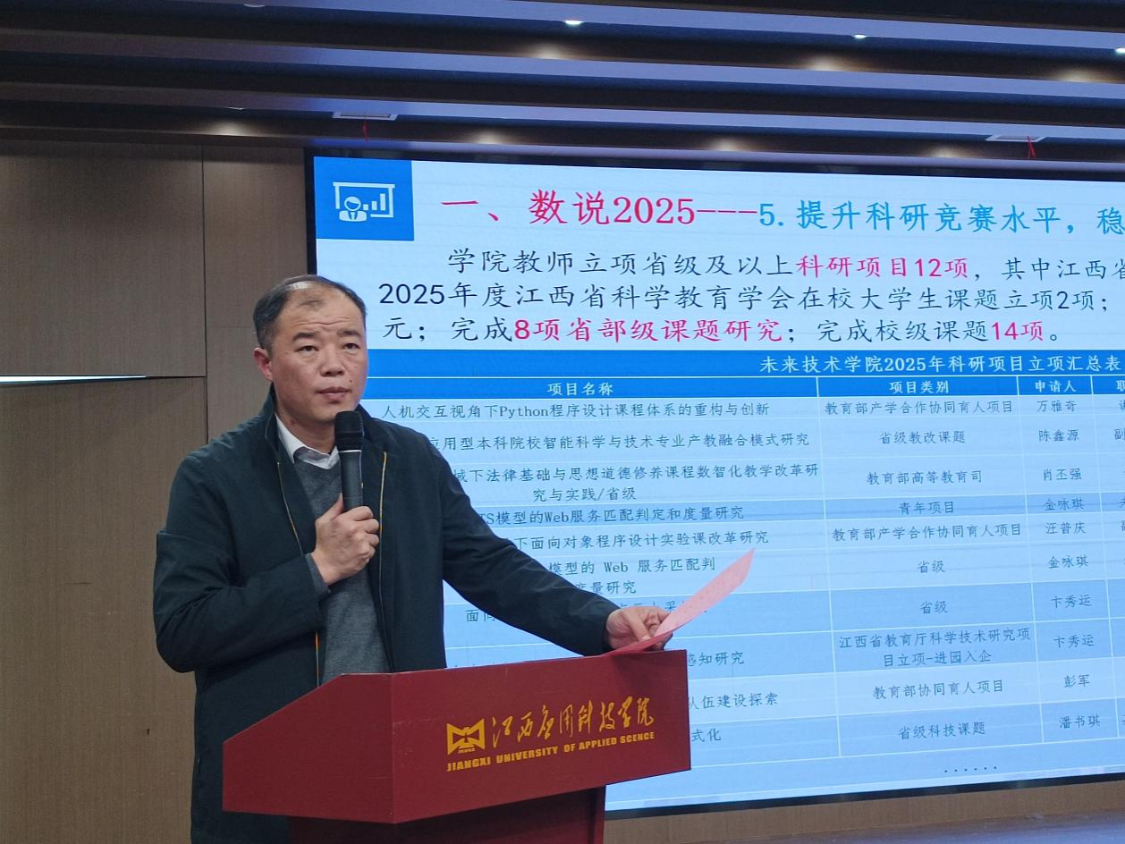 为全面总结2025年度工作成效,压实岗位履职责任,凝聚学院发展合力,1月25日,未来技术学院在辰林音乐厅召开2025年度工作述职会议。学校党委委员、副校长谢远健,院长卞秀运,副院长赵应丁、彭军,学院全体教职工、各校企合作单位工程师、兼职教师参加会议。