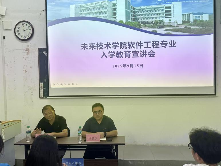 2025年9月15日下午,未来技术学院软件工程专业入学教育宣讲会在三达楼阶梯3教室隆重举行。学院副院长赵应丁博士和软件工程专业教研室主任汪普庆出席本次活动,为2025级新生带来了一场内容丰富、指导性强的专业介绍与学习规划宣讲。