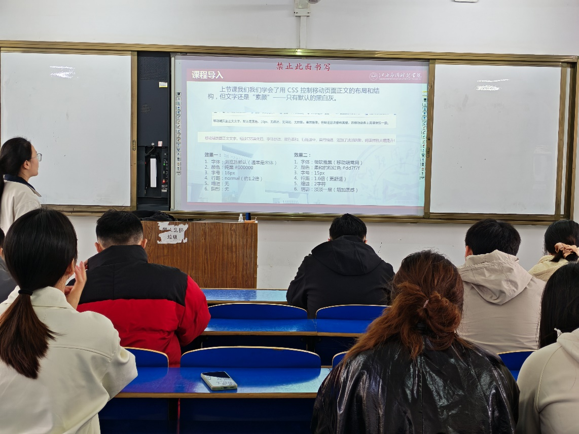 为进一步提升课堂教学质量,促进教师专业成长,近日,软件工程教研室顺利开展本学期第一次公开课教学活动。本次公开课由教研室优秀教师张小丽、张小翠主讲,围绕前端开发核心技能展开专题授课,全体教研室教师参与听课、评课,教学氛围浓厚,成效显著。
