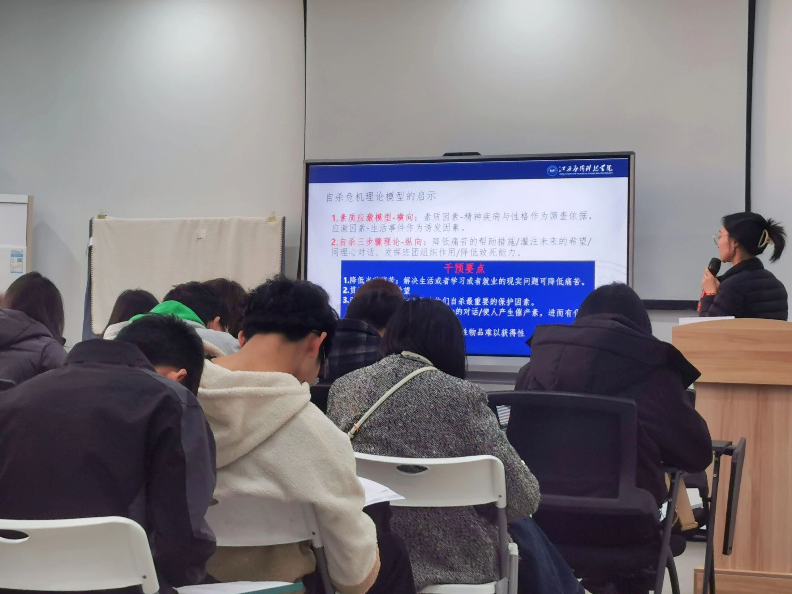 南昌大学第二附属医院心身医学科心理治疗师侯丹妮讲授的《心理风险的评估与处理》,从临床与精神卫生视角提供了专业补充。侯老师介绍了常用的标准化心理评估工具,讲解了如何初步鉴别常见心理障碍,并明确了心理工作与医疗工作的边界与合作方式,增强了辅导员工作的规范性和科学性。