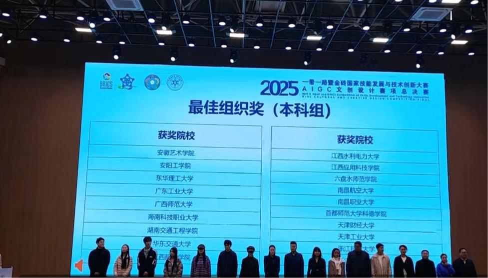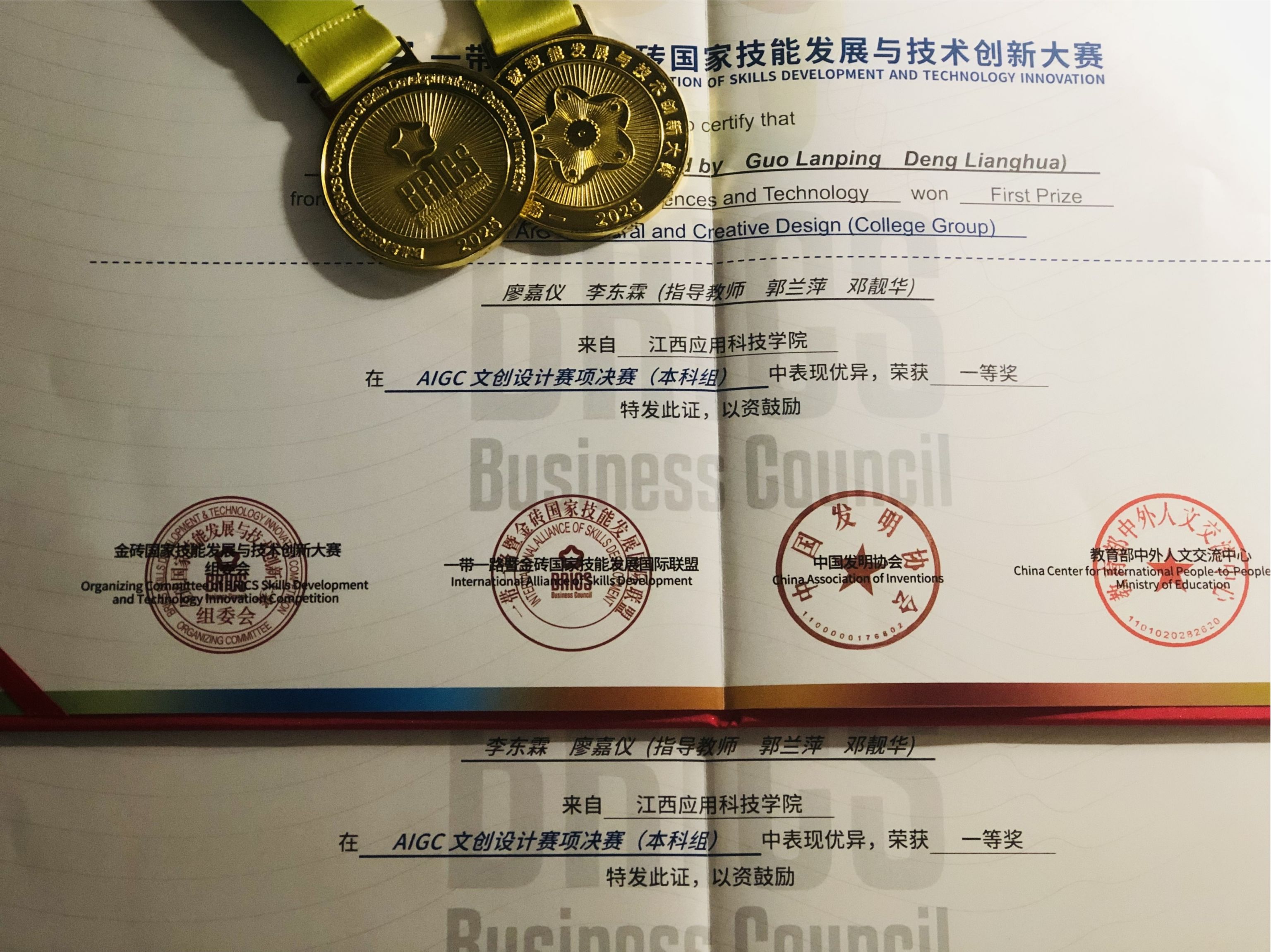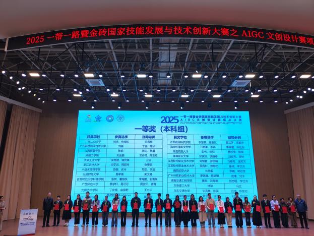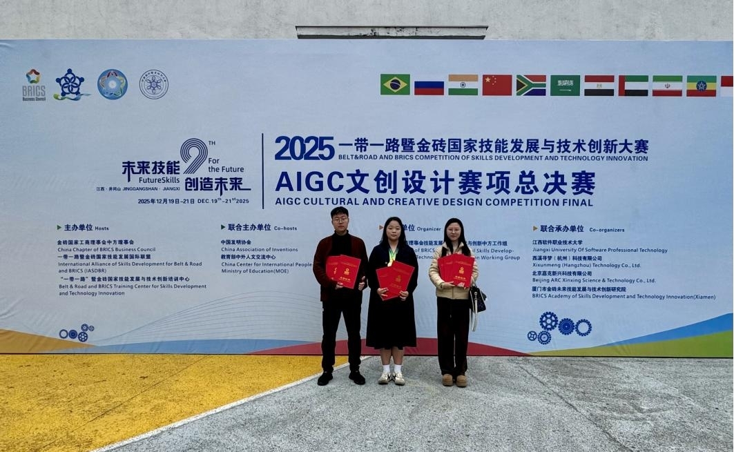 2025年12月19日至12月21日,2025年“一带一路暨金砖国家技能发展与技术创新大赛——AIGC文创设计赛项总决赛”圆满落幕。江西应用科技学院艺术设计学院在本次国家级赛事中表现优异,由郭兰萍、邓靓华两位教师担任指导教师,指导学生李东霖、廖嘉仪组成本科生团队参赛,最终凭借出色的综合表现荣获国赛一等奖,充分展现了学校在人工智能与文创设计融合领域的教学成果与人才培养实力。