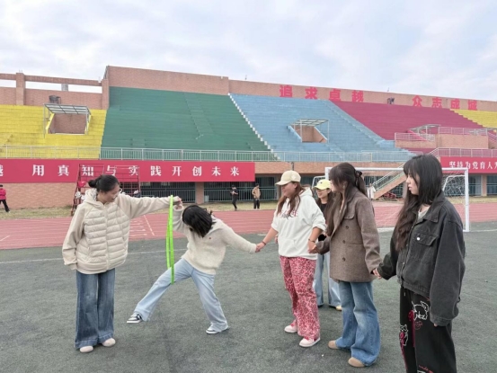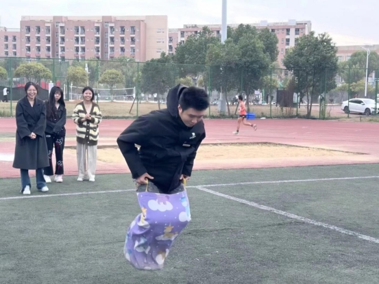 活动中,“摸石头过河”“一圈到底”“袋鼠接力跳”三个兼具趣味性与协作性的项目依次开展。各小组精准配合、奋勇争先,现场氛围热烈,充分展现了团队协作与拼搏精神。