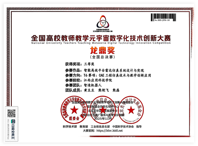 近日,第六届全国高校教师教学元宇宙数字化技术创新大赛获奖名单正式揭晓。智造学院机器人工程教研室黄豆豆老师凭借其精心设计的教学创新方案《智能高效平台雷达仿真系统设计与实现》,在全国众多优秀参赛作品中脱颖而出,荣获国家级三等奖,展现了我校教师在教育教学数字化转型前沿领域的探索实力与创新成果。