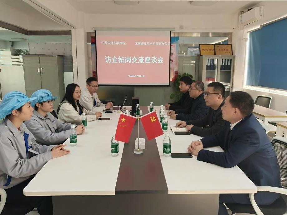 为扎实推进访企拓岗促就业工作,深化产教融合、校企合作,2026年1月15日,学校党委委员、副校长刘宇中带队,智造学院院长蒋德勇、教务处副处长张梁、电子信息产业学院(龙南)副院长彭忠全一行,赴龙南骏亚电子科技有限公司、江西联茂电子科技有限公司开展走访调研,并慰问在岗实习生。